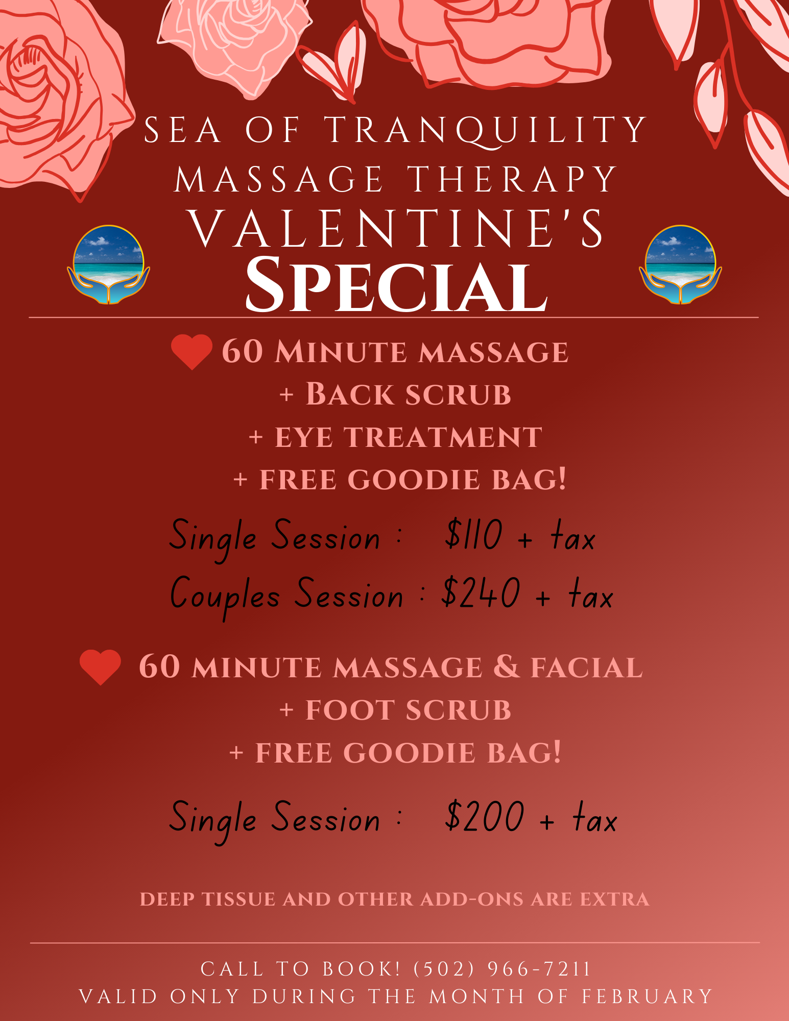 Can upgrade to deep tissue or add any other enhancements at additional cost. Valid only during the month of February.